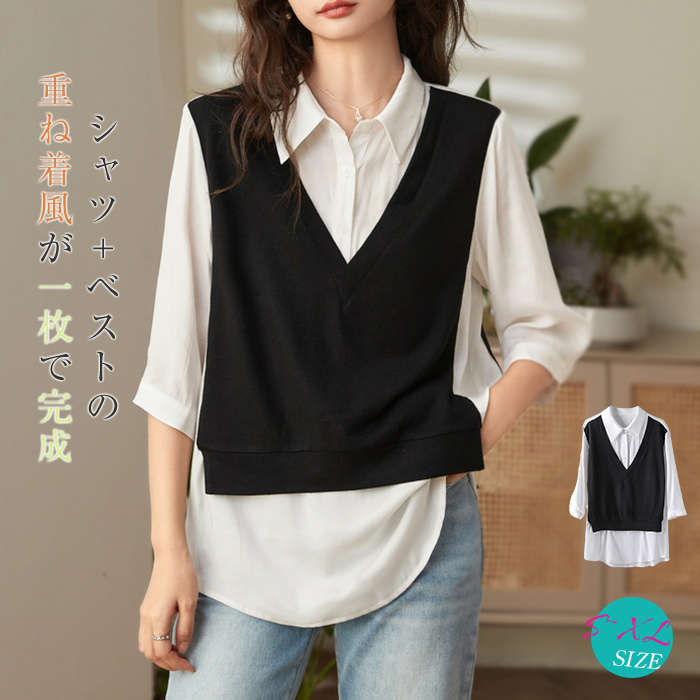 シャツ レディース 春 秋 ベスト 重ね着風 トップス プルオーバー ゆったり おしゃれ 白 黒 グレー 女性らしい 可愛い エレガント通勤 20代 30代 40代