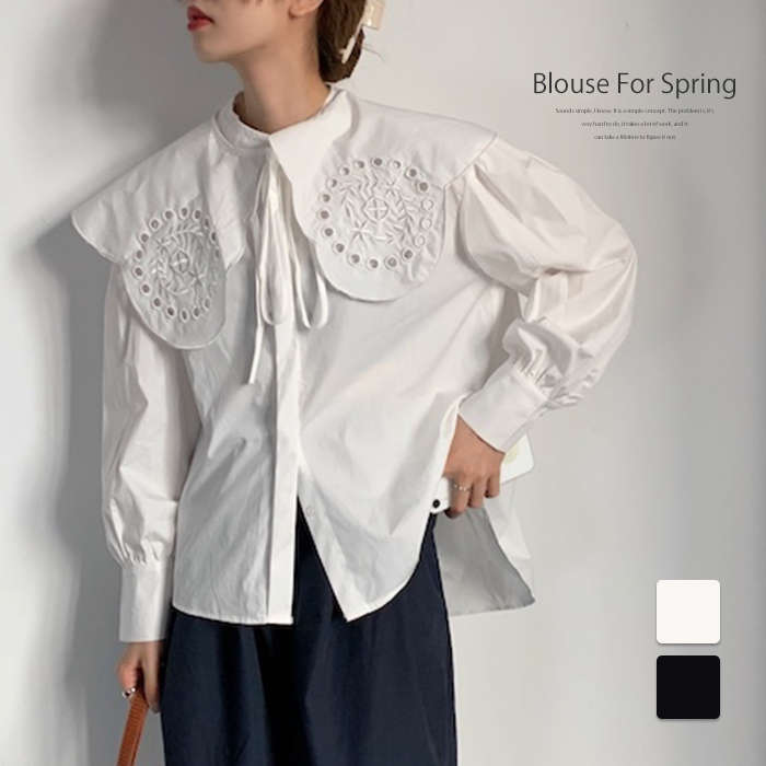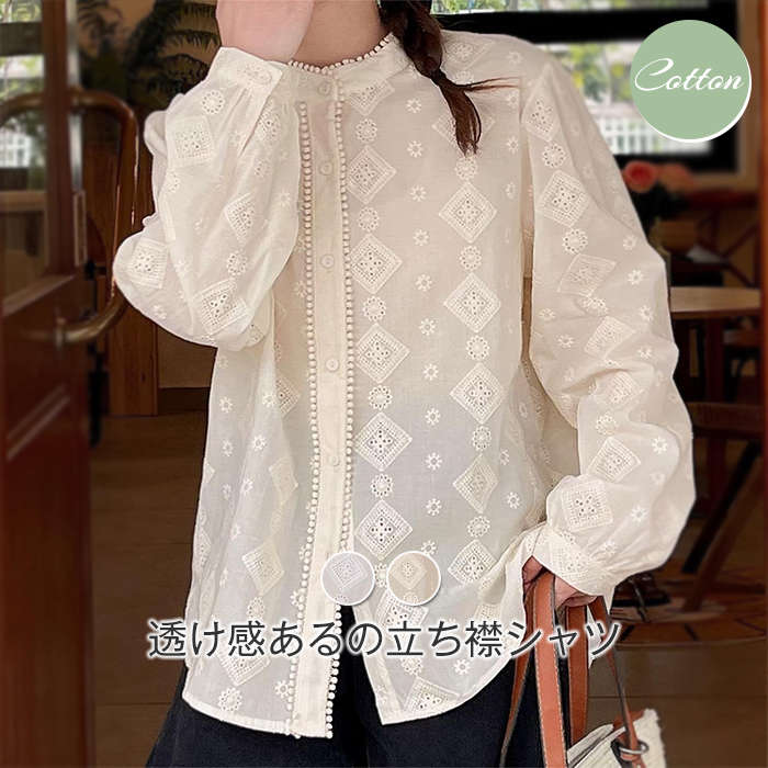 ブラウス レディース 立ち襟 長袖 お洒落 刺繍 透かし雕り コットン 綿 プルオーバー オフィス 春 秋 トップス きれいめ 大人 カジュアル フェミニン エレガント 体型カバー ゆったり 20代