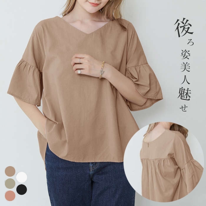 ブラウス レディース シャツ 春夏 薄手 オフィス ボリューム袖 羽織り きれいめ コットン 棉 トップス 七分袖 五分袖 無地 Vネック エレガント 洗える 切り替えブラウス とろみ 春 夏 ホワイ