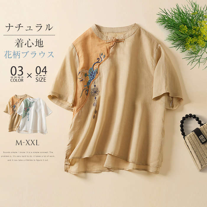 ブラウスシャツ レディース 綿麻風 プルオーバー トップス シャツ カットソー コットン リネン おしゃれ 夏 ゆったり 刺繍 ママ コーデ 薄手