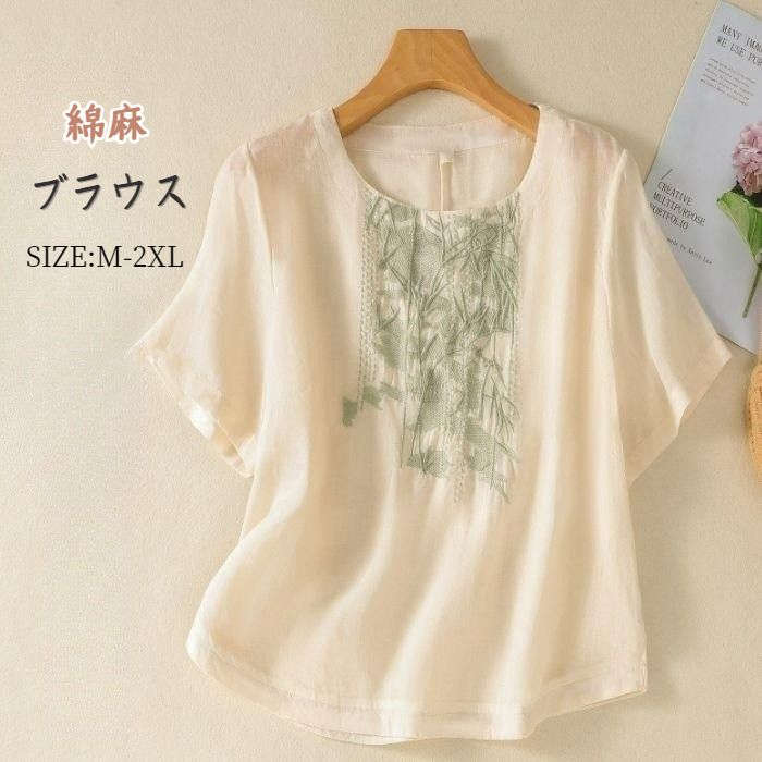 ブラウスシャツ レディース 綿麻風 プルオーバー トップス tシャツ カットソー コットン リネン おしゃれ 夏 ゆったり 刺繍 ママ コーデ 薄手