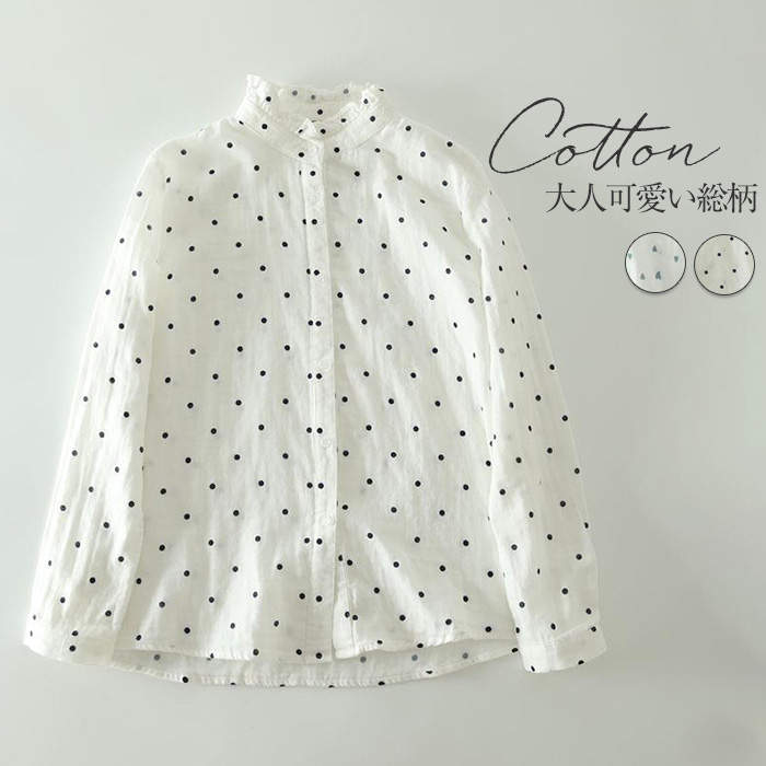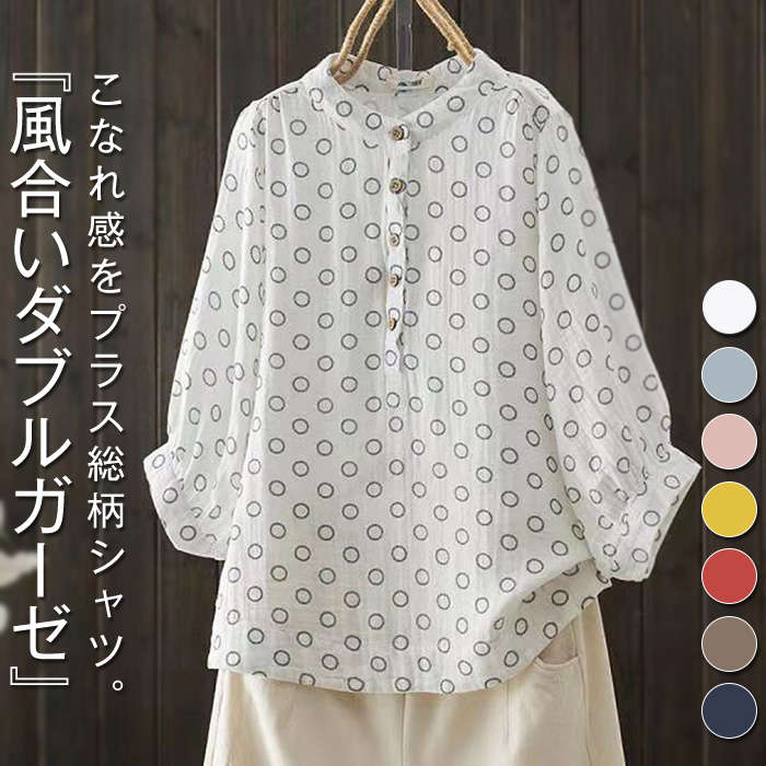シャツ レディース 長袖 おしゃれ ブラウス 総柄 立ち襟 ガーゼシャツ 春夏 トップス 大人 ゆったり シンプル 前開き 綿 コットン 可愛い カジュアル きれいめ 20代 30代 40代 50代