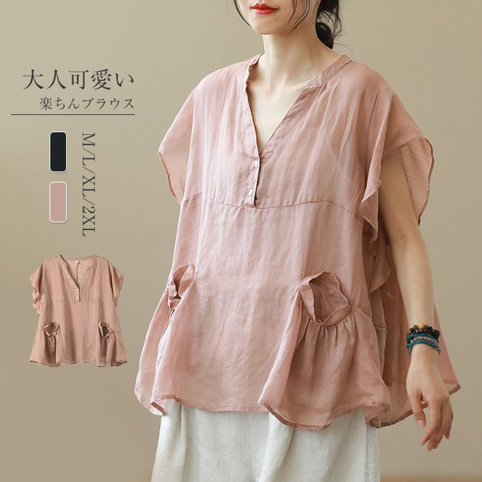 ブラウス レディース 春 夏 半袖 トップス 無地 刺繍 ラウンドネック プルオーバー tシャツ シャツブラウス ふんわり 綿麻 大人 可愛い ゆったり 大きいサイズ 体型カバー シンプル オシャレ
