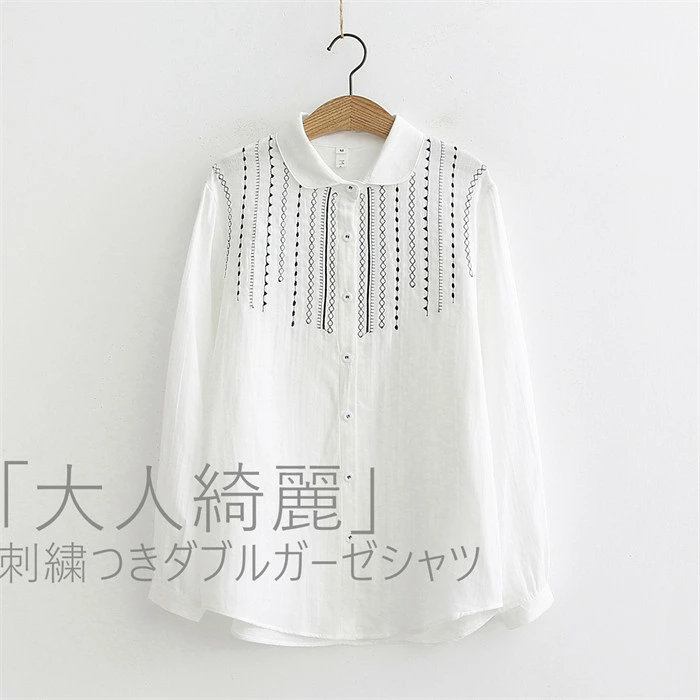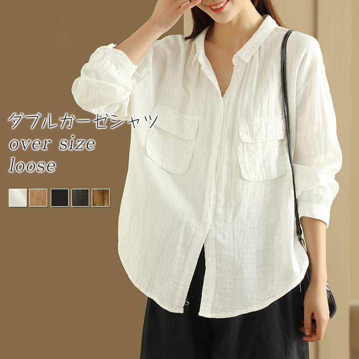 シャツ レディー ダブルガーゼス 長袖 おしゃれ ガーゼシャツ 春秋 折り襟 トップス ブラウス 羽織 ゆったり 体型カバー きれいめ 抜き襟 オーバーサイズ フォーマル オフィス 通勤 着やせ 前開