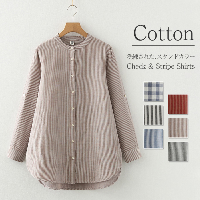 シャツ レディース 長袖 ストライプ チェック ダブルガーゼ スタンドカラー トップス ブラウス ゆったり可愛い きれいめ お洒落 春 夏 秋 デニムシャツ ショート丈 羽織り カーディガン 通勤 カ