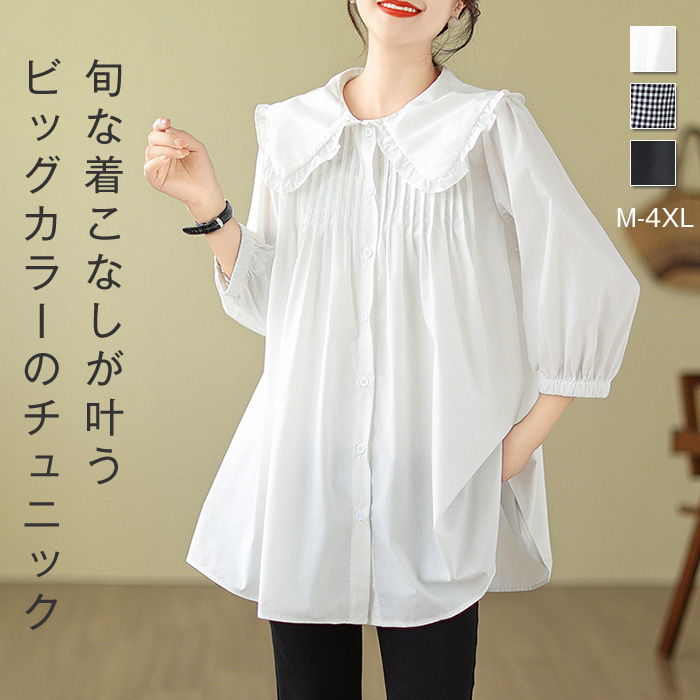 カジュアル感のあるシャツです ビッグカラーとAラインデザインでで気になる所もカバー、可愛く軽やかな印象 通勤コーデにも日常コーデにも似合う一枚♪