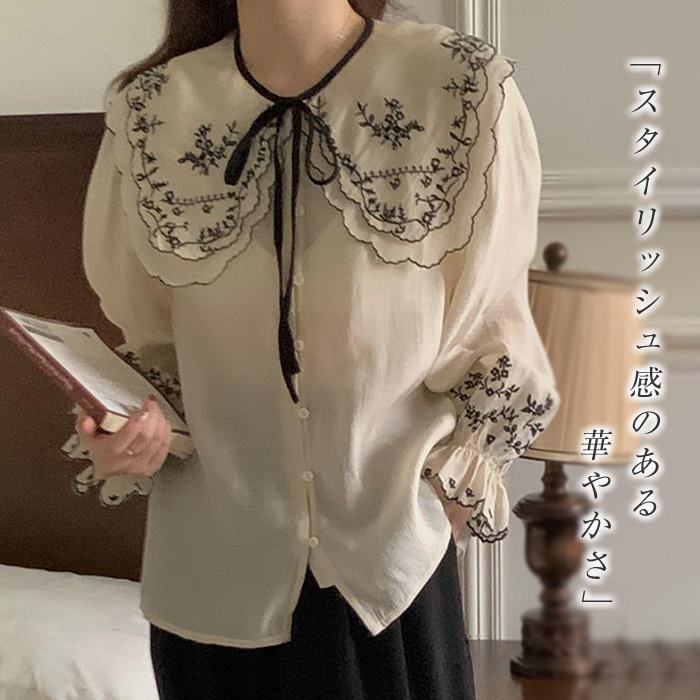 ブラウス レディース 長袖 刺繡 お洒落 透け感 トップス ポワン袖 春ブラウス シャツ 可愛い 入学式 オフィス 白ブラウス 長袖 春秋 おしゃれ きれいめ カジュアル 体型カバー お呼ばれ 通勤
