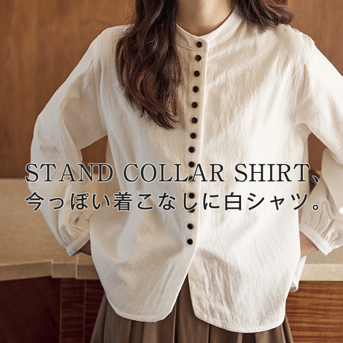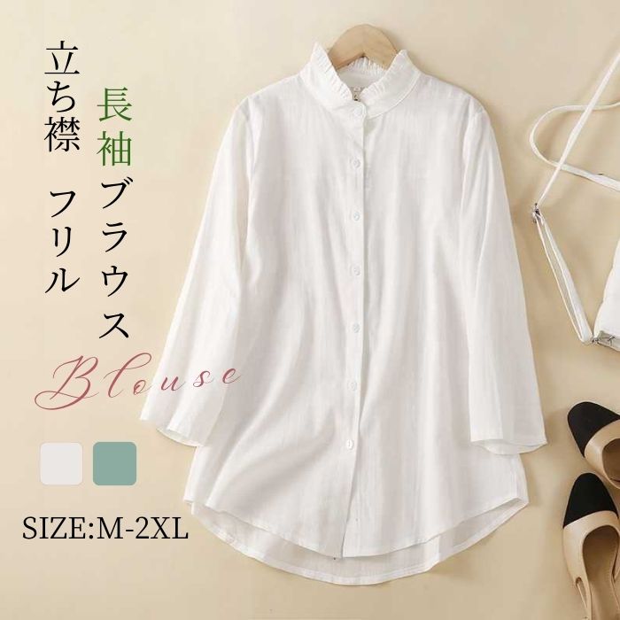 シャツ ブラウス フリルブラウス レディース フリル 長袖 立ち襟 ハイネック 無地 薄手 秋 春 夏 おしゃれ かわいい ミディアム丈 フレア コットン トップス 大人 シンプル 流行 トレンド フ