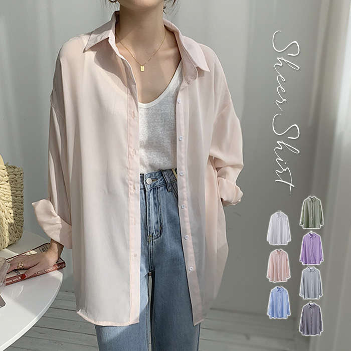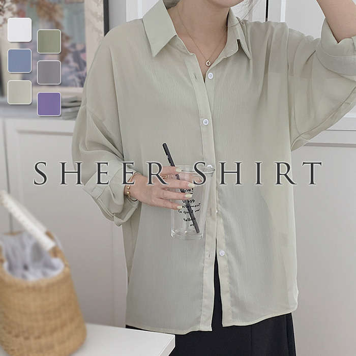 全7色 使い回し シアーブラウス Sheer Shirt 春夏 S M L 大きいサイズ ホワイト パーブル ブルー グリーン グレー ピンク 白 緑 プレゼント 贈り物 ギフト 母の日 ♪
