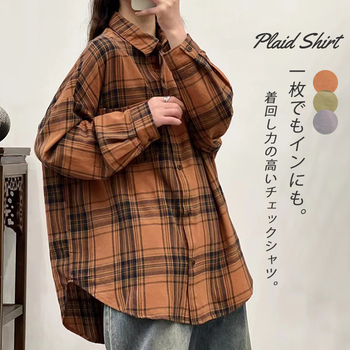 シャツ レディース 長袖 ブラウス チェック柄 入学式 トップス オフィス 長袖 折り襟 春秋 おしゃれ ゆったり きれいめ カジュアル 体型カバー お呼ばれ 通勤 通学 卒業式 卒園式 入園式 オレ