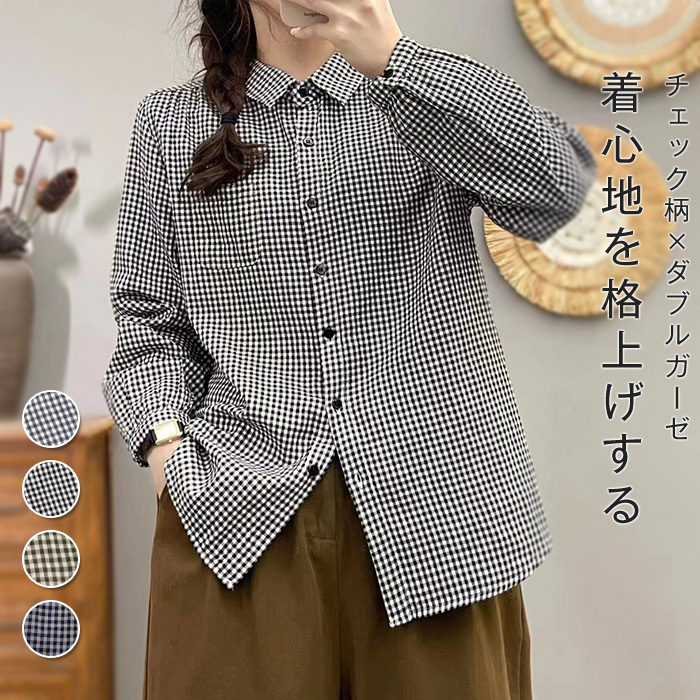 シャツ レディース 長袖 綿 チェック柄 ブラウス ダブルガーゼ 入学式 トップス オフィス 長袖 折り襟 春秋 おしゃれ ゆったり きれいめ カジュアル 体型カバー お呼ばれ 通勤 通学 卒業式 卒