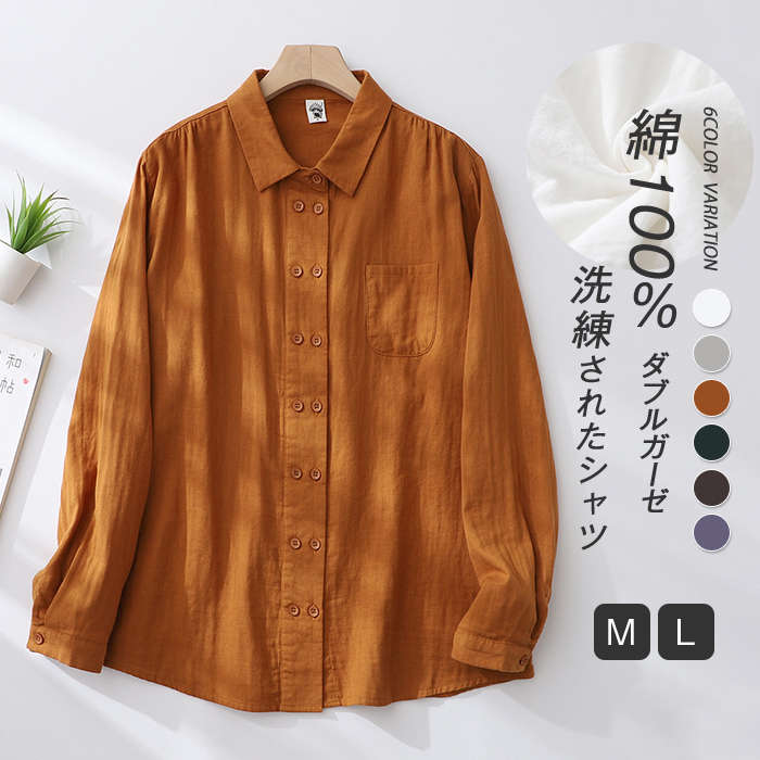 ダブルガーゼ シャツブラウス レディース ガーゼ シャツ ブラウス 長袖 トップス ガーゼシャツ 2重がーぜ 通気性 ゆったり 着回し 定番 重ね着 体型カバー