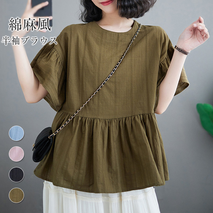 リネンブラウス レディース かわいい 可愛い トップス プルオーバー 前開き カジュアル シャツ ブラウス 体型カバー ゆったり 通勤