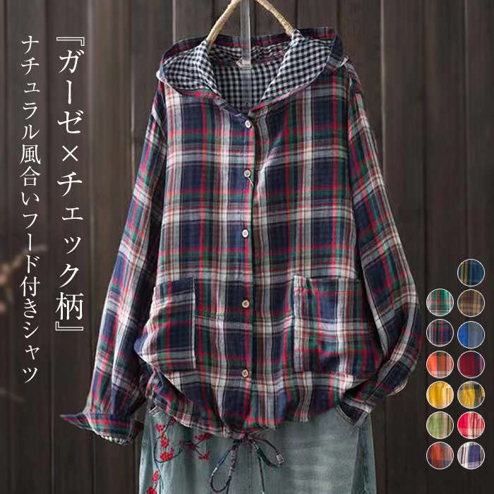 シャツ レディース 長袖 春 おしゃれ チェック柄 フード付き ダブルガーゼシャツ ブラウス パーカー トップス フォーマル オフィス 大人 ゆったり シンプル 綿 コットン プルオーバー カジュアル