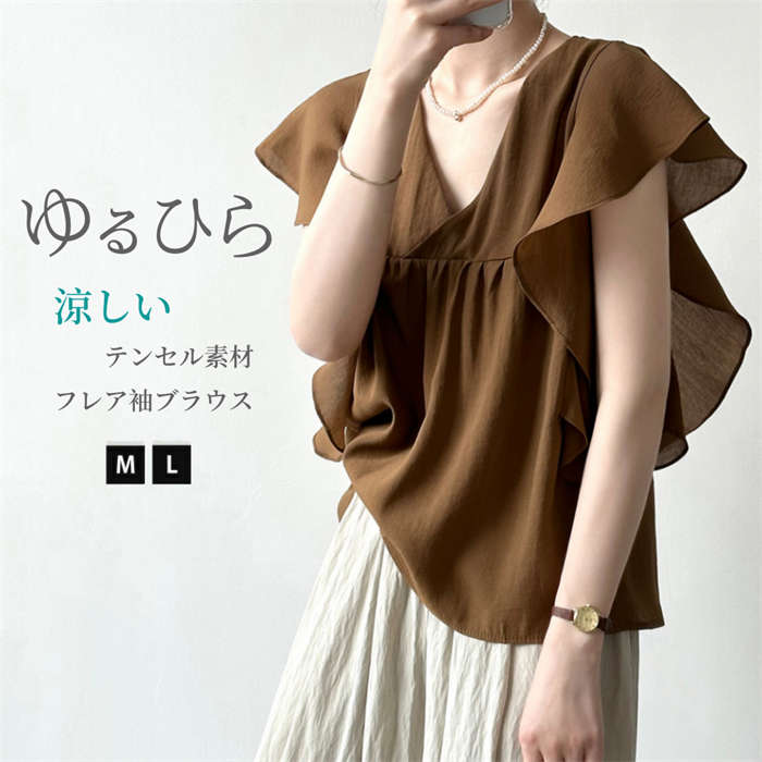 ひんやり テンセル素材 フレアスリーブブラウス ブラウン 茶色 フォーマル オフィスカジュアル セミフォーマル パーティー 結婚式 ママ お食事会 お呼ばれ デート デイリー ♪