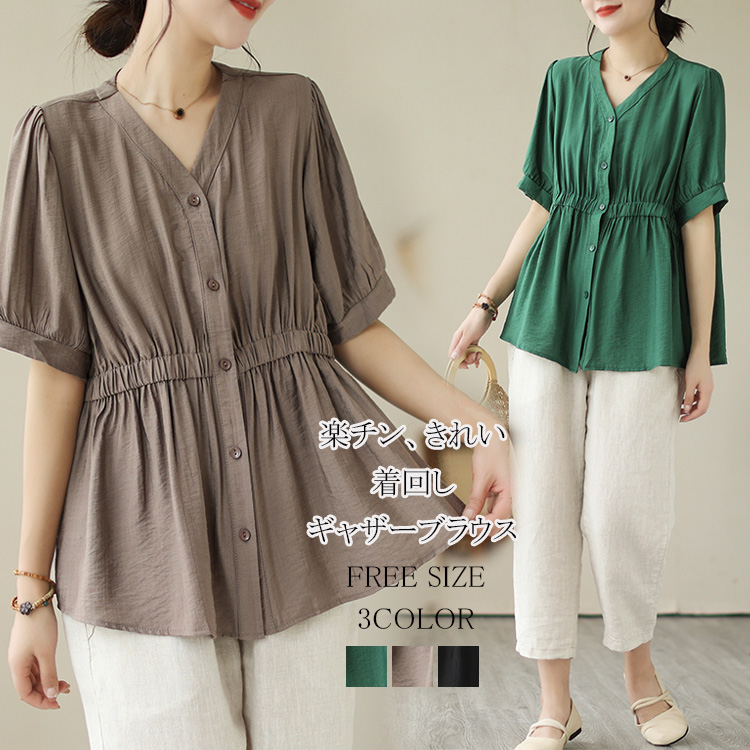 楽チン、きれいめ Vネックシャーリング加工シャツブラウス シャツ レディース 半袖 ブラウス 黒 トップス 春夏 きれいめ 30代 40代 50代 フリーサイズ 着痩せ ゆったり おしゃれ