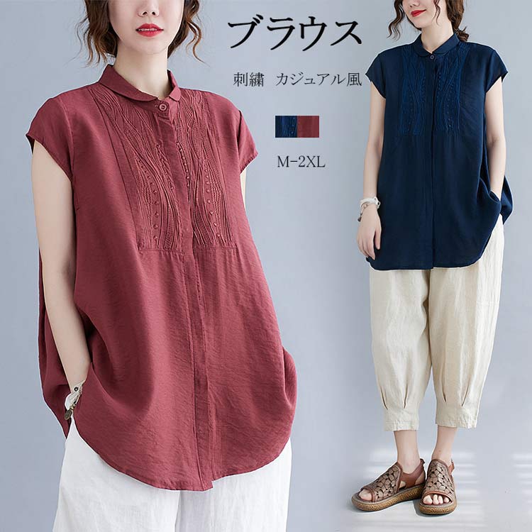 シャツ 綿麻 シャツブラウス ナチュラル シンプル トップス きれいめ 刺繍 カジュアル レディース 春服 夏服 可愛い