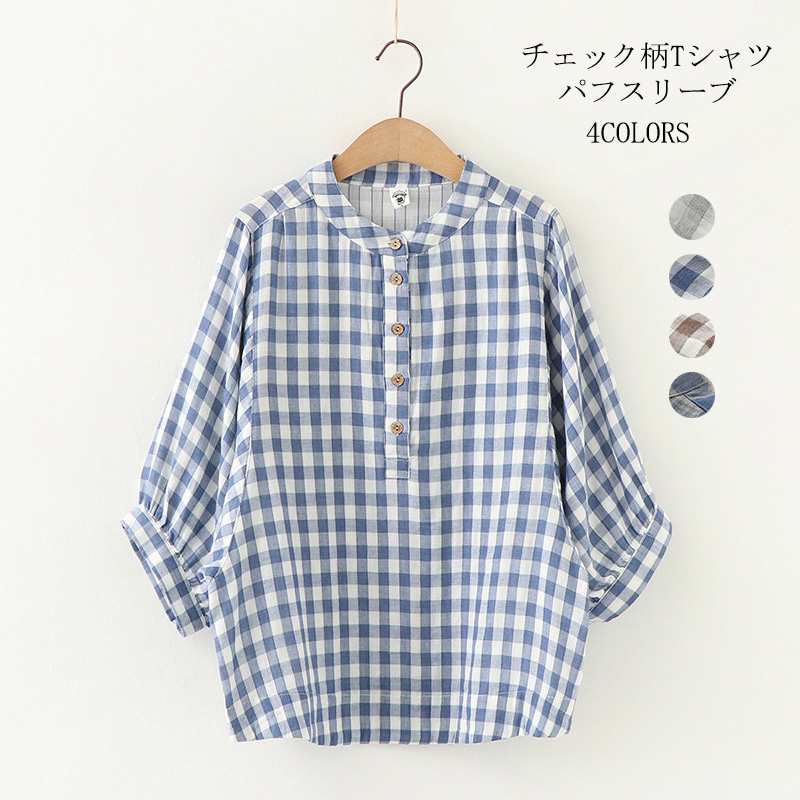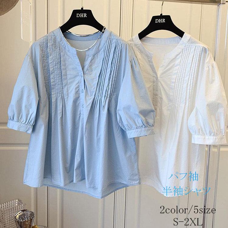 パフスリーブ シャツ レディース ブラウス 半袖シャツ プリーツシャツ 半袖ブラウス 夏 プルオーバー バンドカラー コットン 無地 20代 30代 40代 かわいい カジュアル S M L XL 2