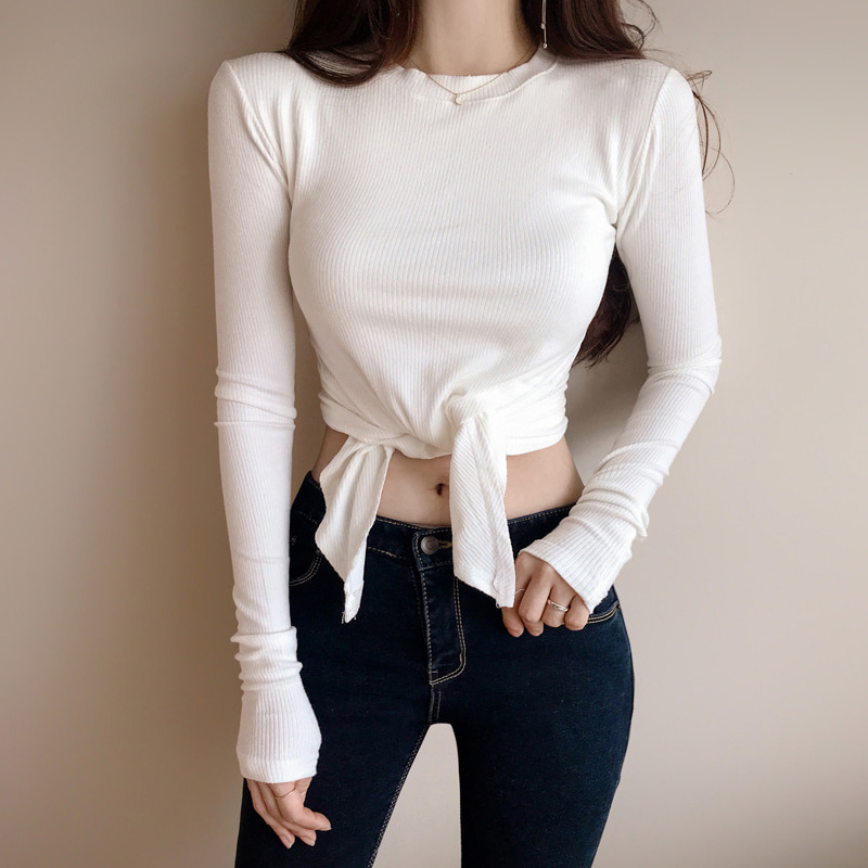 レディース トップス 結び ひじ出し ラウンドネック 長袖 ショート丈 カジュアル シンプルレディースファッション トップス シャツ ブラウス