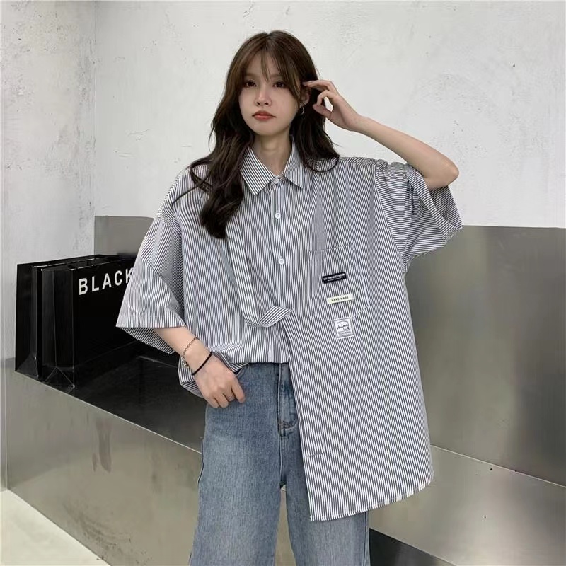 シャツ レディース 夏 ゆったり トップス 半袖 可愛い カジュアル 薄手 ストライプ柄 通勤 ブルー ブラック M L XL SLUA130