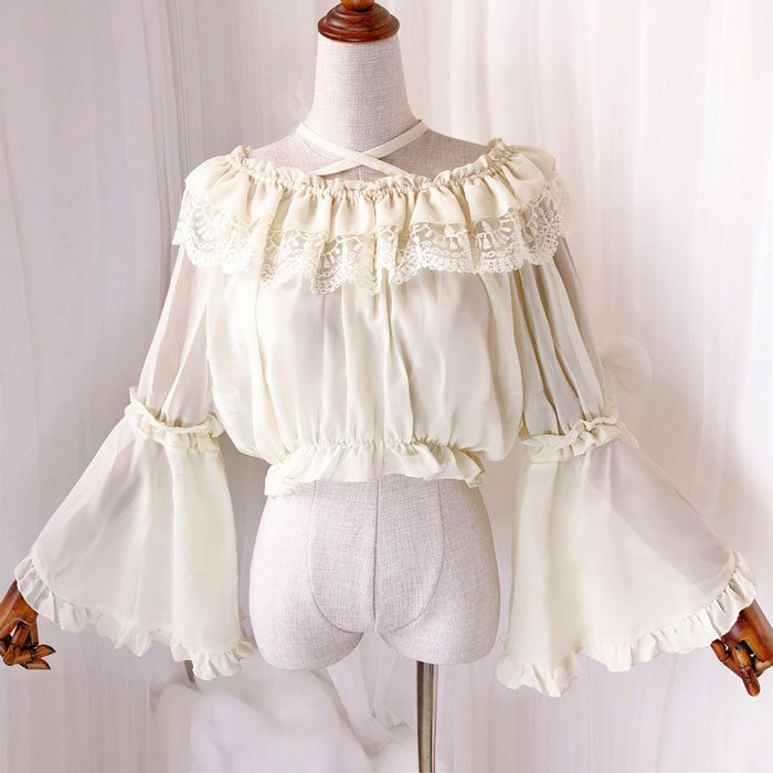 シフォンブラウス レディース ブラウス 長袖 トップス シフォン 2way レース フリル 袖フレア 袖フリル シースルー レイヤード ゴスロリ ロリータ お嬢様 お姫様 可愛い ロリータファッション