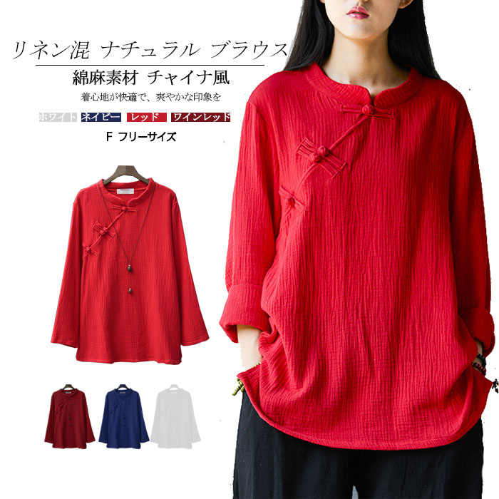 ナチュラル ブラウス レディース トップス 無地 チャイナ風 シャツ お洒落 チャイナカラー アンシメトリー 太極拳 服 ウェア