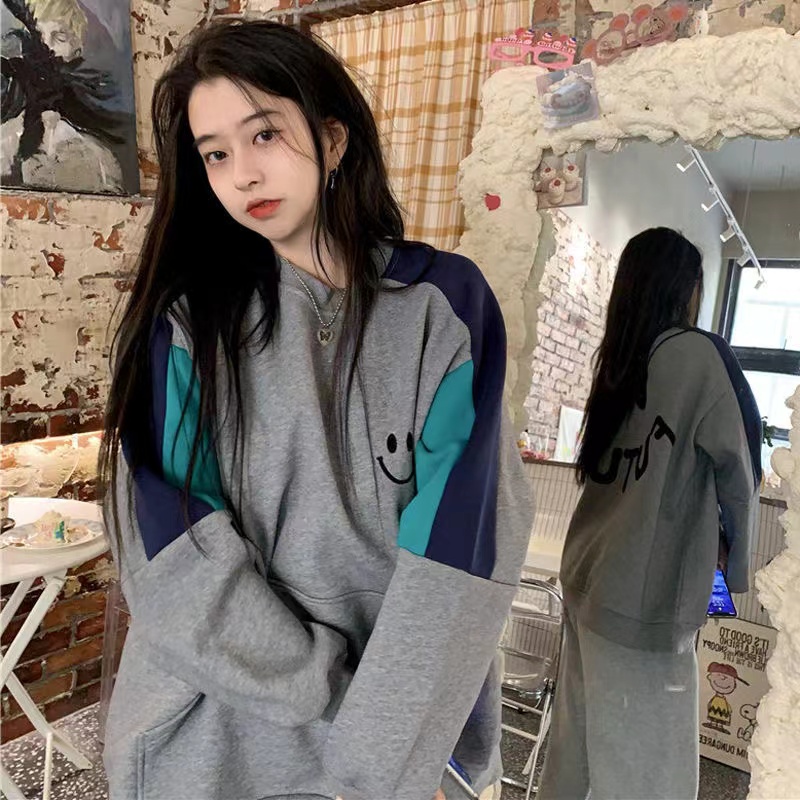 レディース トレーナー 春秋 ゆったり カジュアル 丸首 トップス 長袖 スマイル柄 薄手 英文字 可愛い おしゃれ 2 042