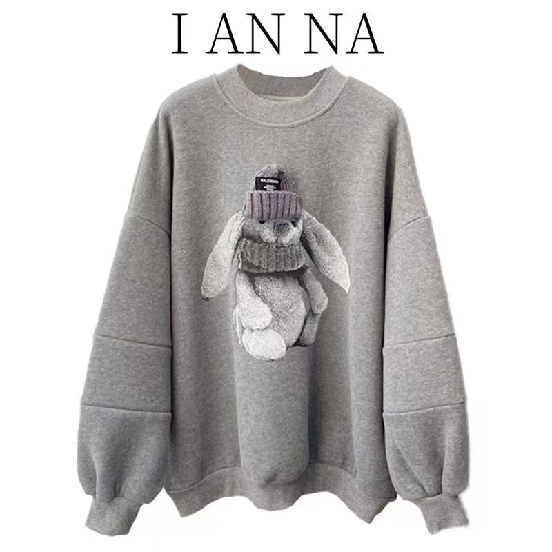 トレーナー レディース 春秋 ゆったり 長袖 ウサギ柄 トップス 通勤 カジュアル 可愛い 丸首 グレー ブラック 2 037
