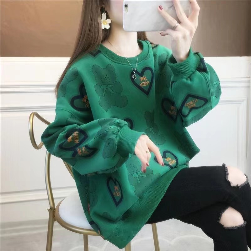 トレーナー レディース 春秋 ゆったり トップス おしゃれ カジュアル 長袖 可愛い 丸首 クマ柄 グリーン ホワイト 2 390