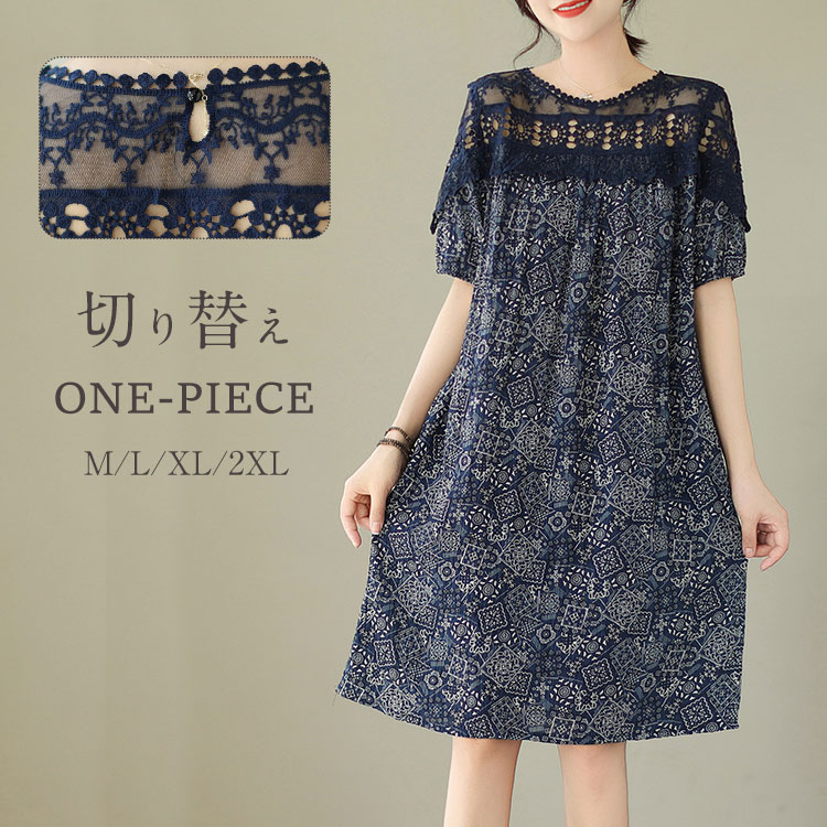 レースドッキングおしゃれ半袖チュニックワンピース 大人 可愛い レトロ風半袖ワンピース 夏用ワンピース チュニックワンピース ブラウス トップス 刺繍 お尻カバー