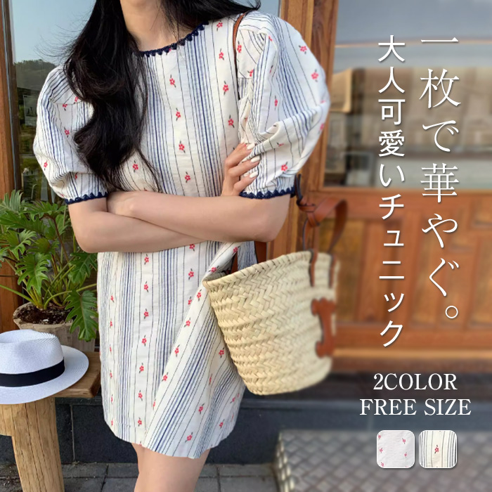ワンピース レディース チュニック 夏 薄手 半袖 可愛い ポワン袖 花柄 トップス クルーネック ゆったり 体型カバー ロン カジュアル おしゃれ カットソー きれいめ シンプル ミニワンピース