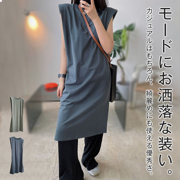 Tシャツ ワンピース ノースリーブ トップス タンクトップ tシャツワンピース カットソー 薄手ポンチ 肩パット レディース 体型カバー 春 夏 秋