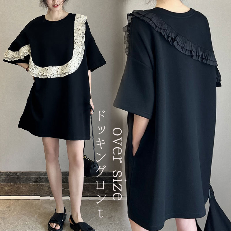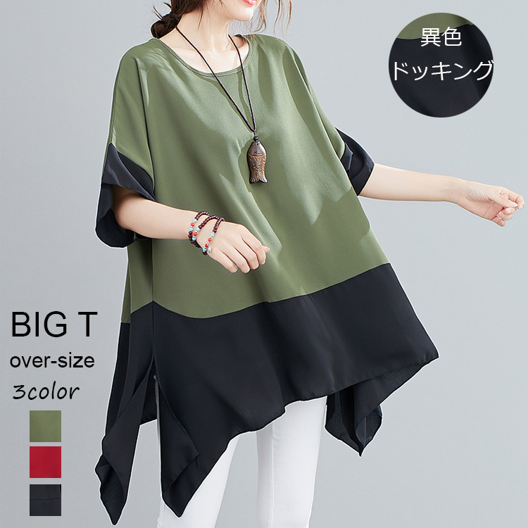 大きいサイズ アシメ 切り替えシャツ レディース 春夏 ドッキング トップス シャツ ビッグtシャツ ビッグサイズ オーバーサイズ BIG サイドスリット チュニック ビッグシルエット 黒