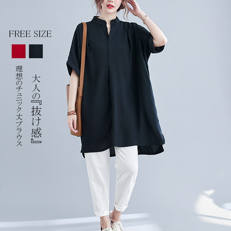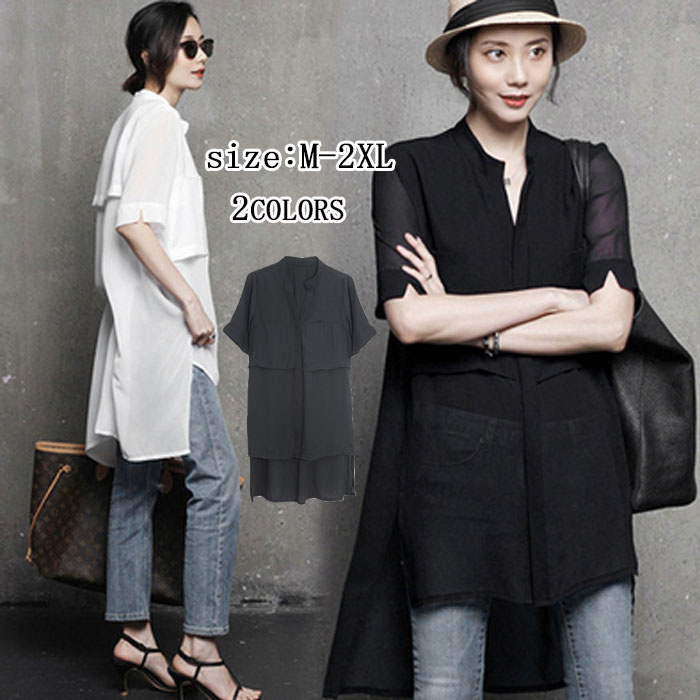 シャツブラウス レディース チュニック 前後差 オーバーサイズ 大きいサイズ 体型カバー カジュアル風 20代 30代 40代 ゆったり 着痩せ キレイめ 楽ちん 春 夏 黒