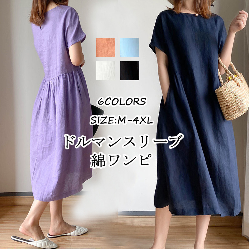 体型カバー力抜群着痩せ見せ綿Tシャツワンピ 大人可愛い カジュアル ドルマンスリーブ 着心地がいい 春 夏 秋 aラインワンピ グルネック ロング丈ワンピース M L XL 2XL 3XL 4XL