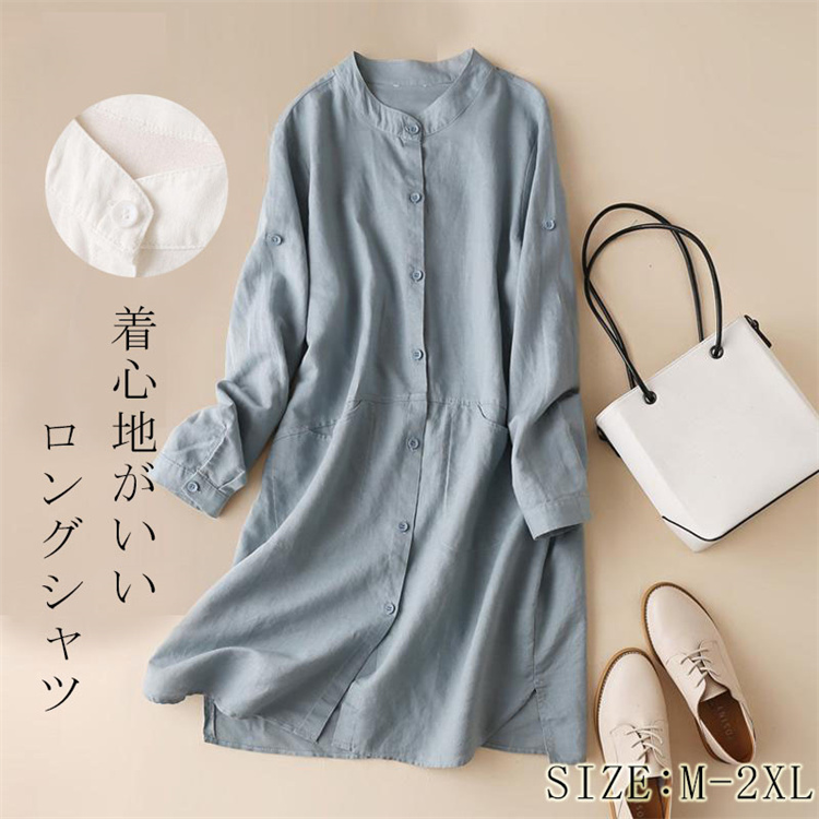 お尻までカバーできる大人可愛いチュニックシャツブラウス 綿麻 ロング 薄手 体型カバー 着痩せ ゆったり
