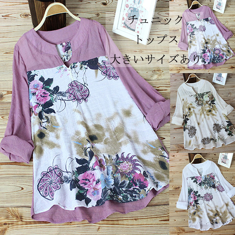 チュニック ロングシャツ チュニックシャツブラウス プルオーバー 大きめサイズあり プリント柄 2 3 4 5 30代 40代 50代