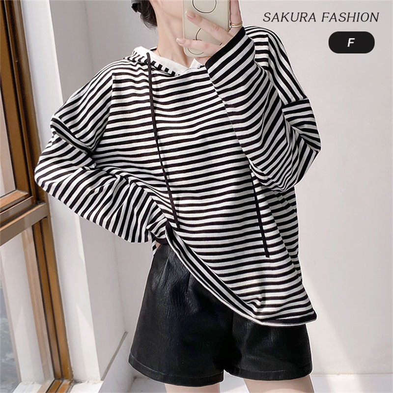 パーカー レディース トップス トップス フーディー プルオーバー カットソー 長袖 綿混 ボーダー ゆったり 秋 ボーダーフーディー