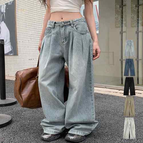 レディース ハイウエストロングパンツ 体形カバー 美脚脚長ボトムス 韓国風ジーンズ カジュアル レトロデニムバギーパンツ 脚長ジーパン着やせ ストレート デニム ゆったり 高見え