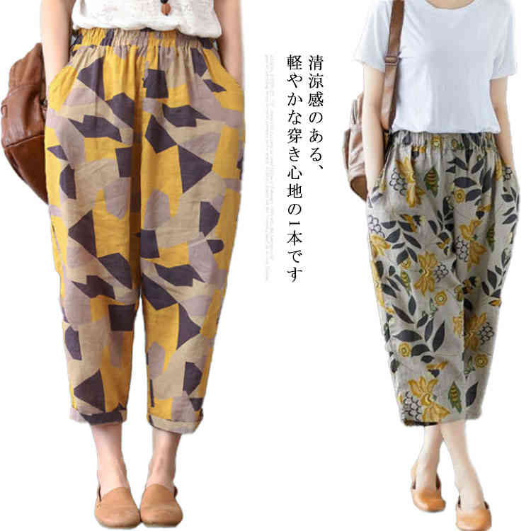 ワイドパンツ レディース 7分丈 棉麻 クロップドパンツ リネンパンツ サルエルパンツ テーパードパンツ カジュアルパンツ 水玉 ドット 花柄 ゆったり