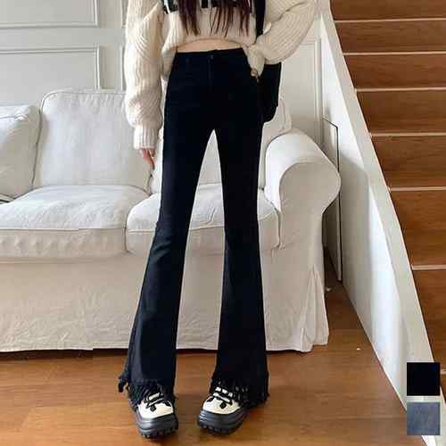 ハイウエスト スキニーデニムパンツ 着やせ カジュアル ロングパンツ おしゃれ 裾フリンジ ジーパン 細身 スリム 韓国 ボトムスストレート ジーンズ春秋低身長 デニムフレアパンツ
