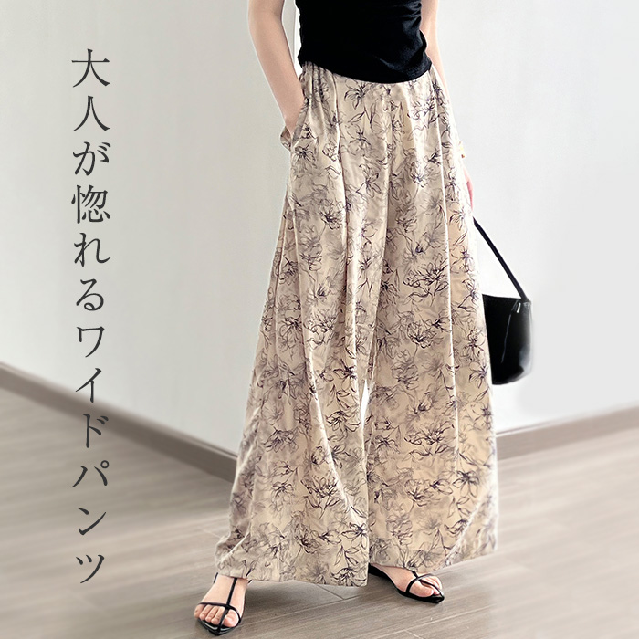 ワイドパンツ レディース 夏 薄手 ボトムス 花柄 ファション ポケット付き ロングパンツ マキシ 体型カバー 着痩せ 涼しい20代 30代 40代♪