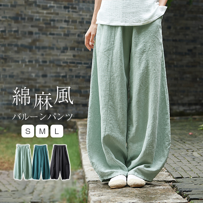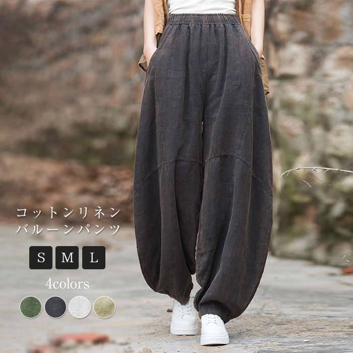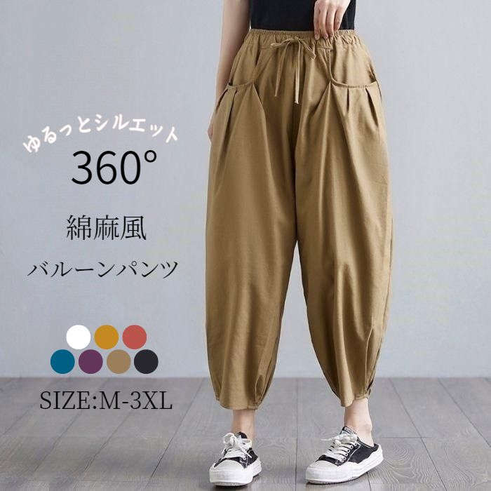 バルーンパンツ ワイド ボトムス レディース サーカスパンツ ロング丈 春 夏 秋 おしゃれ 流行 可愛い カジュアル 麻 リネン 綿 コットン シンプル ポケット 着回し 快適 通気性 大人可愛い