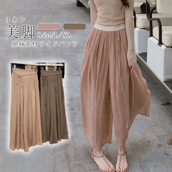 綿麻素材で穿き心地抜群♪ワイドパンツ レディース ボトムス 綿麻 ウエストゴム リボン 体型カバーレディースファッション ボトムス パンツ