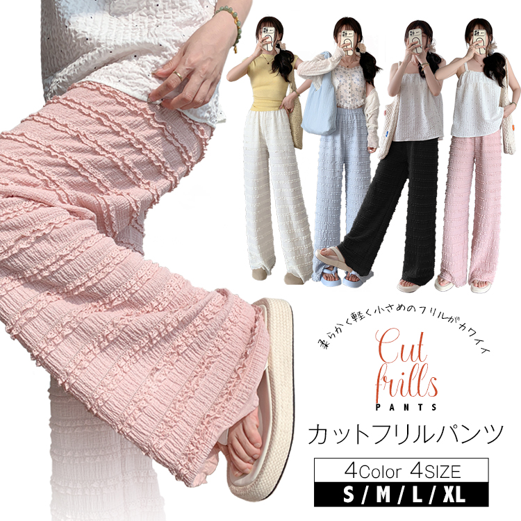 カットフリル ワイドパンツ レディース ハイウエスト ワイドパンツ ミルフィーユ レース フリル ボトムス 春夏 ゆるふわ フレアパンツ ロング丈 ウエストゴム レイヤード 重ね着 楽ちん
