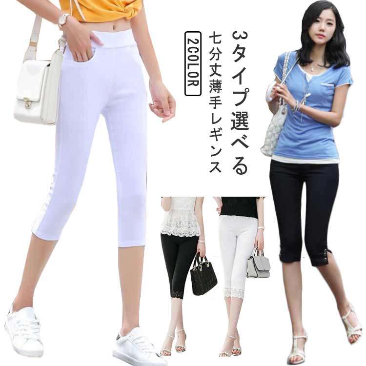 3タイプ選べる 七分丈 薄手レギンス レギンス レディース レース付き ボタン ポケット ストレッチレギンス パギンス