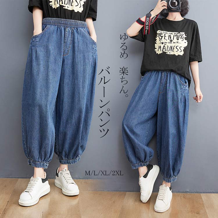 リピしたい九分丈デニムバルーンパンツ デニムバルーンパンツ ジンーズ ジーパン ロングパンツ ブルー キレイメ ゆるめ ルームウェア 日常ウェア