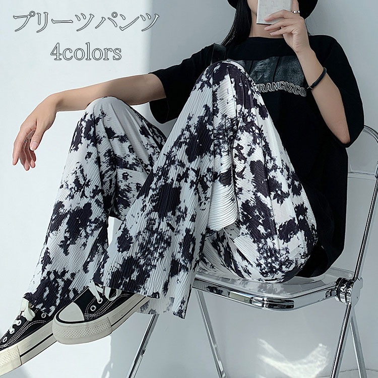 プリーツパンツ セルフカット リブパンツ レディース カットオフ 総柄 ボトムス イージーパンツ ワンマイル ワイドパンツ ウエストゴム 大人 カジュアル