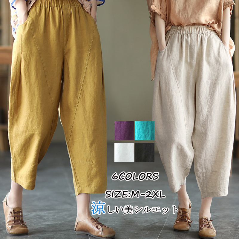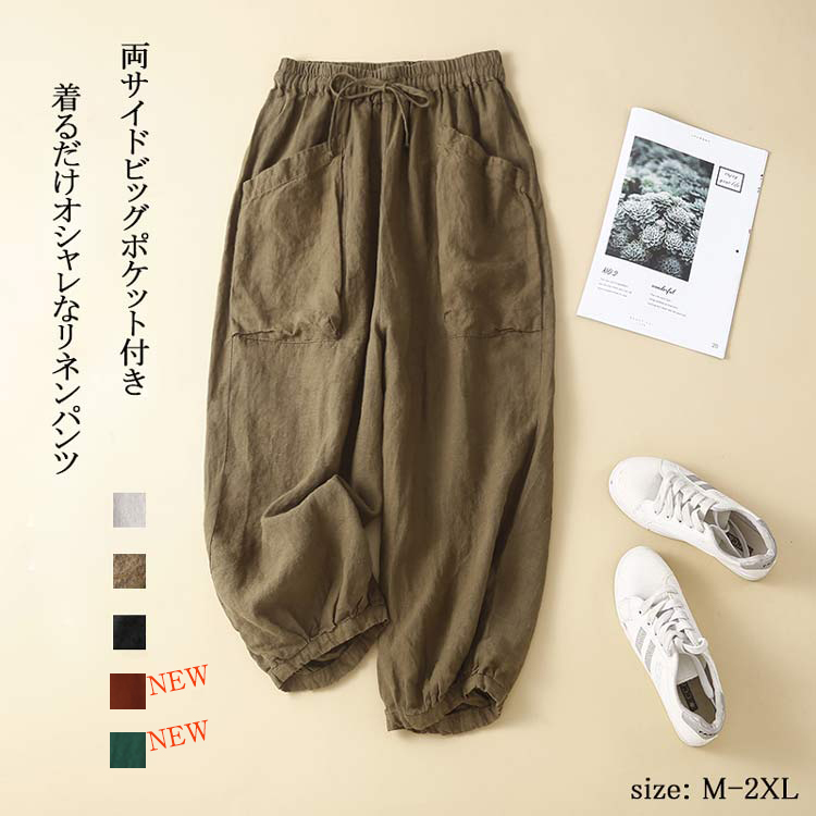バルーンパンツ レディース 夏 麻 パンツ カジュアルパンツ 九分丈 ウェストゴム コクーンパンツ ギャザー ゆったり ナチュラル 体型カバー