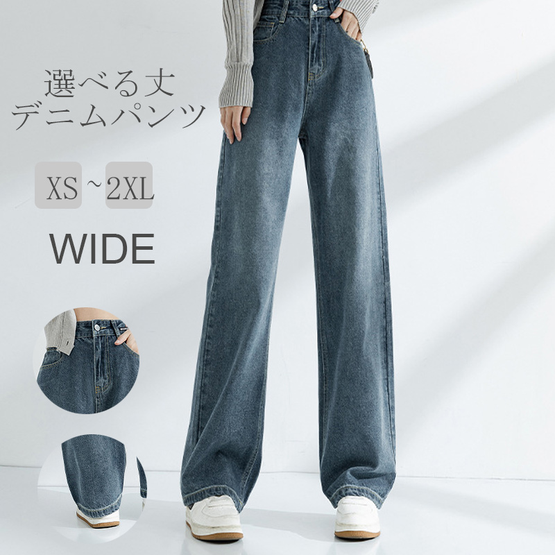 選べる丈 デニムパンツ レディース ロングパンツ デニム ワイドパンツ ジーンズ カジュアルコーデ ボトムス ストレート ボタン ポケット付き ルーズ おしゃれ ブルー